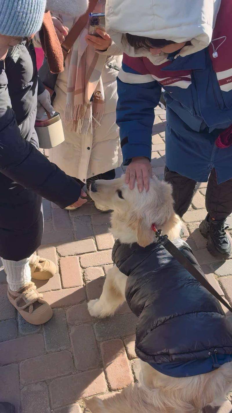 在广场上,常见游客携宠漫步。北京的雷先生带着金毛犬引来众人喜爱,经常被往来的游客摸头、揉脸。雷先生说,自己与女友在此相识,之后共同养了这只金毛犬,明天就是二人的两周年纪念日,也是准备领证结婚的日子,所以特意带爱犬回到这里,留作纪念,“酒店为小狗准备垫子、食盆、玩具,甚至赠送零食,非常贴心。”他说。